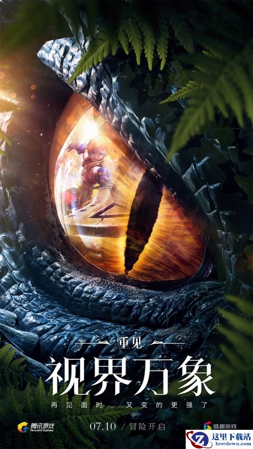第一张海报“重见·视界万象”主体由黄金龙眼,翠绿色的草叶和龙眼中倒映的人物组成,尤其是巨龙眼部嶙峋的皮肤画质更是让人忍不住狂起鸡皮疙瘩。龙瞳的纹路分毫毕现,就连看起来似乎只是装饰用的翠绿色草叶都有非常清晰的锯齿,质感惊人。虽然海报乍看起来毫无头绪。但是谷迷们很快就能从黄色龙瞳和隐隐泛蓝的皮肤中窥见端倪。狰狞的龙瞳中清晰可见金发巨剑的人物形象一下便让人想到《龙之谷》中战士。如果是《龙之谷》,那么这只龙瞳一定属于《龙之谷》游戏中的巨龙。