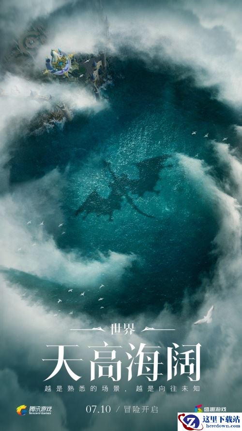 在第三张海报“世界·天高海阔”是从一个俯视的角度展现出一片广袤无垠的大世界场景:水光粼粼的海面上,有一个透过形似龙之谷logo云雾的倒影在辽阔海面上的巨龙阴影,它翅膀和尾翼轮廓棱角分明,而临海的城池中清晰可见一个拥有飘逸长发的女神雕像。熟悉的玩家已经一眼能够认出,这的确是龙之谷世界里位于神圣天堂中的阿尔泰亚女神像。