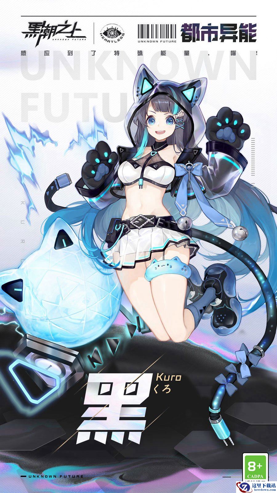 可爱的气息正在接近!猫耳萌动,铃铛作响……《黑潮之上》的少女黑坚持认为自己就是一只真正的黑猫!但普通黑猫可没有这么拉风:又萌又飒的金属猫耳,杀伤力十足的大猫爪,电力满满的插头尾巴,最爱的小鱼干装饰遍布发夹和腰带,再套上连帽镭射透明短装和活力小短裙,一看就是精力爆炸爱耍疯的超级Gamer!为了将黑猫本命贯彻到底,战斗起来自然少不了各种猫界艺能,尖牙利爪,疯狂乱抓……嗯,果然是可爱与实力并存的喵喵大人!