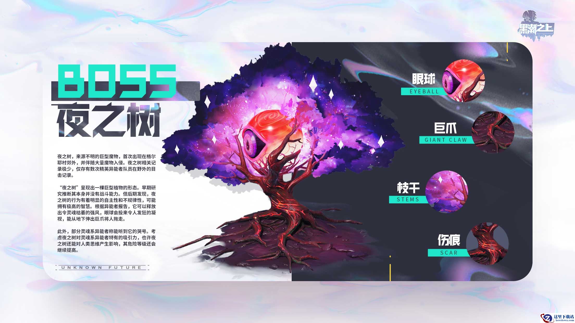 夜之树,一株来源不明的巨型魔物,首次出现的地点就是之前提到的格尔耶村的郊外,它的出现引发了大量魔物入侵格尔耶村的灾难。夜之树相关记录极少,仅存有数次精英异能者队员在野外的目击记录,但都没有造成很大的影响。