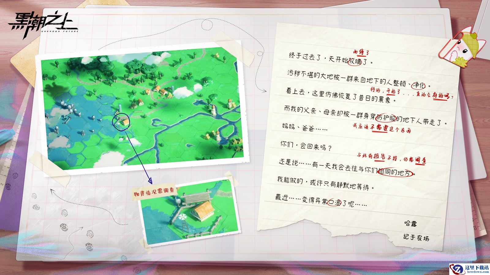 在前期爆料中,《黑潮之上》官方透露,高自由度的沙盘玩法将是新世界的核心内容。从今日公开的首块区域来看,各位接触者密切关注的新世界第一条情报线索已经出现:一张破碎的书信上,记录了一场雨后对「农场」实施「净化」的一幕:父母被一群来自地下、身穿防护服的人带走,而叙述者在静静等待中,感到越来越口渴……农场里究竟发生了什么?这些身穿防护服的人究竟是谁?他们为什么要把人带走?又会去往何方?《黑潮之上》新世界,即将准备各位接触者开启调查!