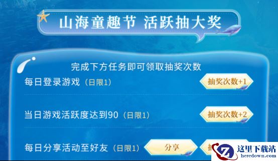 在“山海童趣节”期间,旅者可点击【福利-推荐】内的活动图进入活动页面,通过完成“山海童趣节”内的日常任务,获得抽奖次数。每次抽奖必定获得奖励,还有概率获得奖池内稀有奖品;累积抽奖次数还可获得丰富累抽奖励!