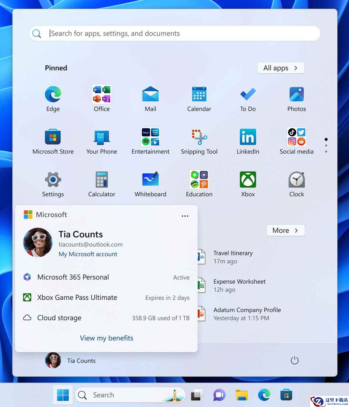 微软在新版本中微调了开始菜单,账户菜单中新增了一个指向用户 Microsoft 365 订阅权益的链接,方便用户快速访问。