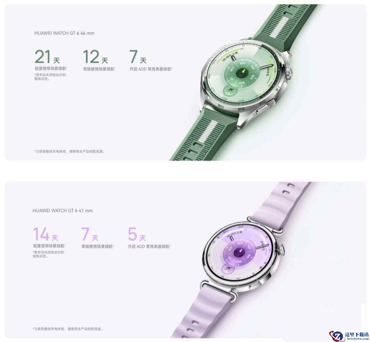 HUAWEI WATCH GT 6 标准版提供 41mm 和 46mm 两种尺寸,满足不同佩戴需求。41mm 版本引入回环型灵动表耳、精致表冠,配备 1.32 英寸屏幕,续航最长 14 天。46mm 版本采用升级的高硅堆叠电池,容量比上一代提升 65%,配备 1.47 英寸屏幕(3000 尼特峰值亮度),续航可达 21 天。
