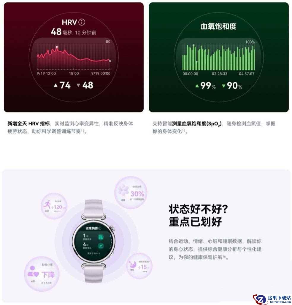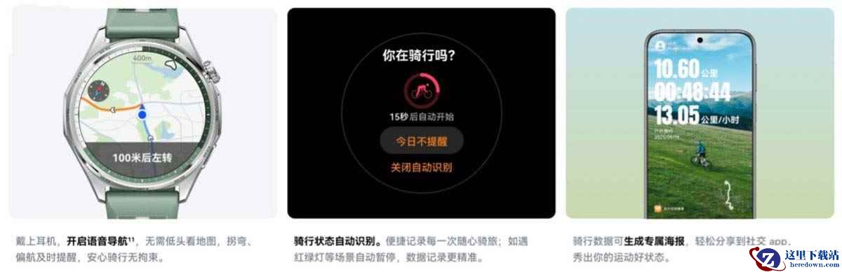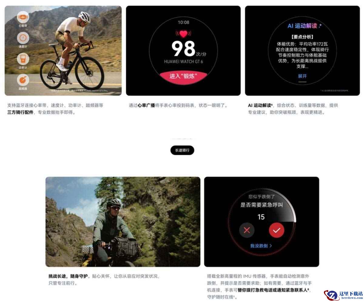 HUAWEI WATCH GT 6 支持蓝牙连接心率带、速度计、功率计、踏频器等三方骑行配件,可通过心率广播将手表心率投到码表。同时,HUAWEI WATCH GT 6 还支持 AI 运动解读,包含综合状态、训练量等数据,并提供专业建议。