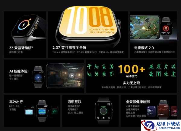 采用方形表盘设计,右侧居中有一颗旋转表冠,正面是2.07英寸超亮全景屏,屏占比达82.4%,峰值亮度2400尼特,相比前代1.85英寸屏幕,视野提升显著。