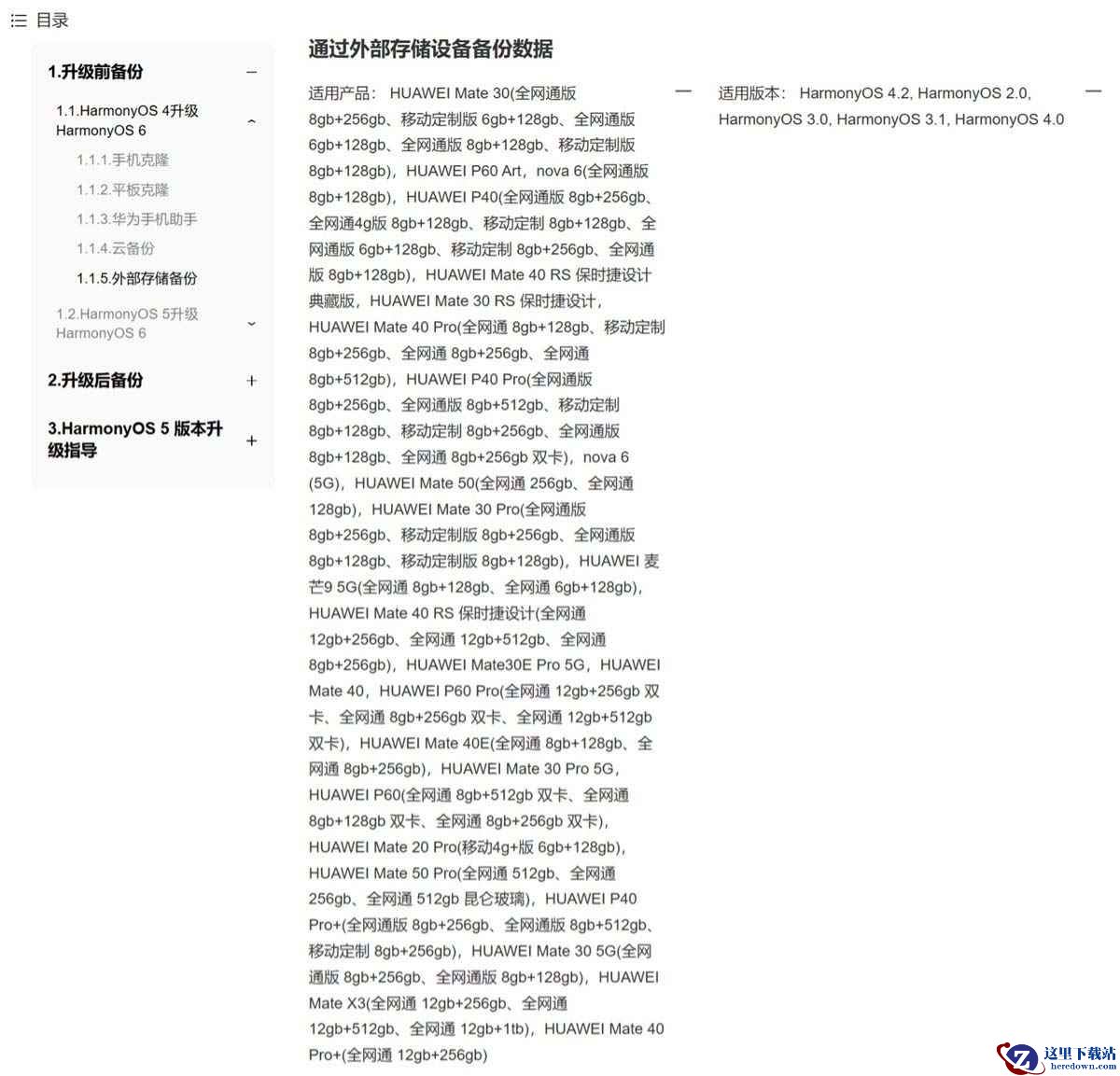 其中,HarmonyOS 4 升级至 HarmonyOS 6 的外部存储设备备份数据公布了机型列表,其中覆盖机型众多,包括 Mate 30/20 系列、P40 系列等。