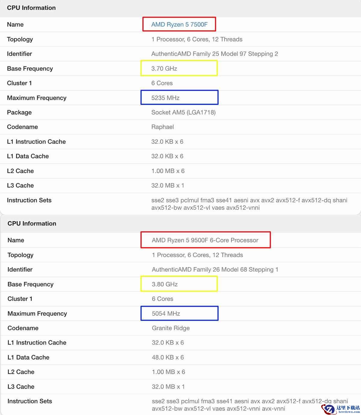从规格来看,AMD Ryzen5 9500F和Ryzen5 7500F 基本上非常相似,最明显的区别在于架构升级,Ryzen5 9500F采用了Zen 5架构,而Ryzen5 7500F则是基于上一代的Zen 4架构。除此之外,两款处理器的核心数、线程数、频率(主频提升了100MHz)、缓存、功耗 等几乎一致。即便如此,厂商仍然对9500F进行了“架构更新”,声称能带来更高的单核和多核性能。