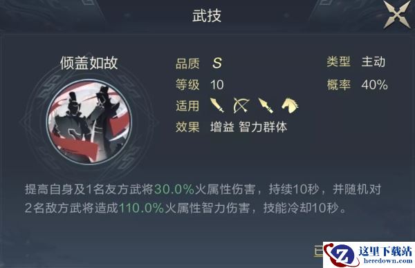新框架中周瑜属于队伍核心输出,推荐博闻范策+火烈风威。配置后他拥有4个主动输出技能,其中2个技能CD为10秒,具备最高效的巧捷叠加效率,武技无论复制火烧连营还是倾盖如故,都对后续火烈风威有明显伤害增益。