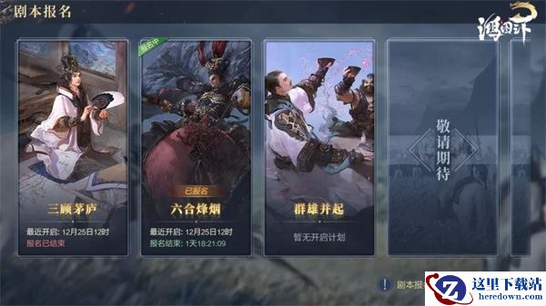 在以往的赛季中,玩家需要根据游戏赛季节奏,被动选择战斗剧本。备战区功能上线后,《鸿图之下》将提供更丰富的征服剧本供玩家选择,助玩家全面实现“剧本自由”。在备战区中,玩家可根据系统公布的开服计划,单人或组队报名中意的赛季剧本。在备战区中主公可组建小队招募其他主公,所有加入队伍的主公默认报名队长所选剧本,并会分至同一大区,个人报名则无剧本限制,大区分配随机。报名成功后,角色将从备战区转入目标赛季剧本,与众多报名同一剧本的玩家汇合,在自己的选择的剧本中进行征战。