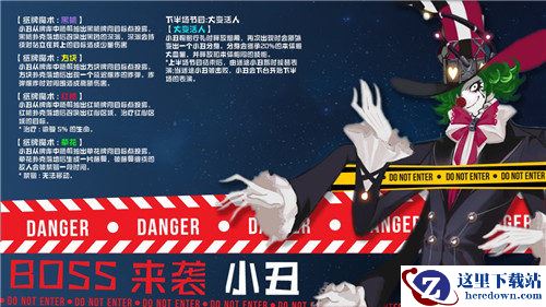 小丑鞠躬行礼时释放烟幕,再次出现时会额外变出一个小丑分身。分身会继承20%的本体最大血量,并释放和本体相同的技能。