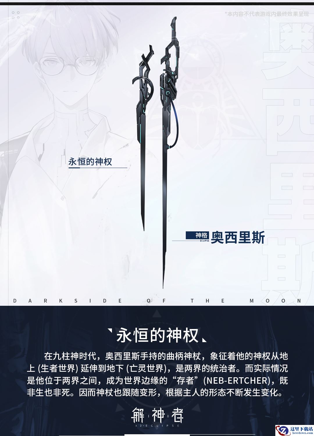 奥西里斯在修复完毕自身数据后总算能创造形体与解神者大人见面啦!奥西里斯的神器——永恒的神权,在九柱神时代,奥西里斯手持的曲柄神杖,象征着他的神权从地上(生者世界)延伸到地下(亡灵世界),是两界的统治者。而实际情况是他位于两界之间,称为世界边缘的“存者”(NEB-ERTCHER),既非生也非死。因而神权也跟随变形,根据主人的形态不断发生变化。