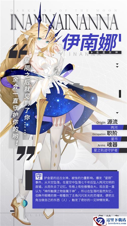 伊南娜是守护金星的远古女神,被蚀的力量影响,爆发“星陨”事件,从天空坠落,在星空中坠落七千年后坠入两河文明的废墟,从而导致失去了记忆。