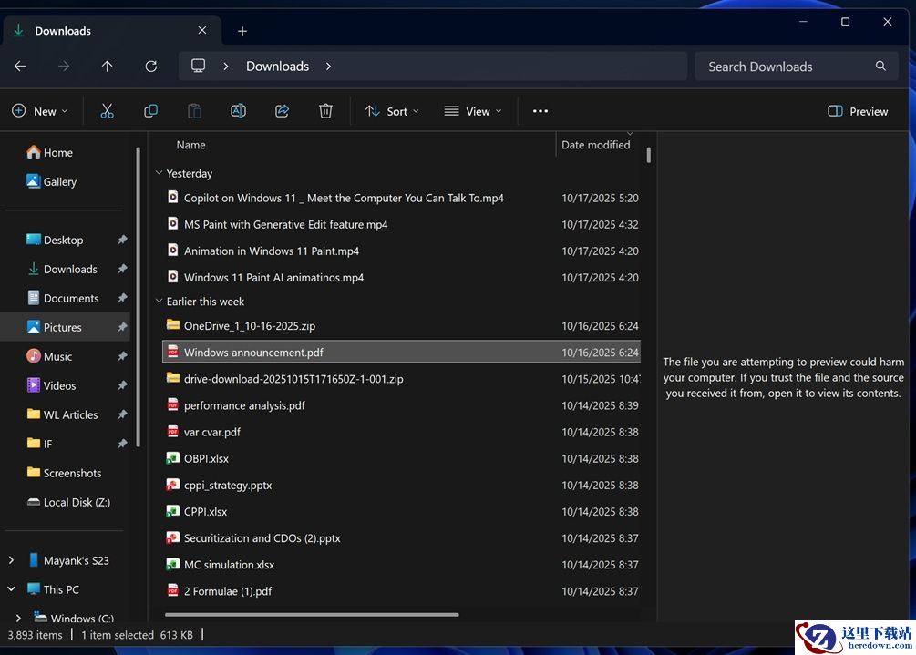 当用户尝试预览一个被标记的文件时,预览窗格将不再显示文件内容,取而代之的是一条系统警告信息。该信息会提示:“您尝试预览的文件可能会损害您的计算机。如果您信任该文件及其来源,请打开它以查看其内容。”这一变化仅针对从互联网下载的文件,用户存储在本地或局域网中的文件预览功能不受任何影响。