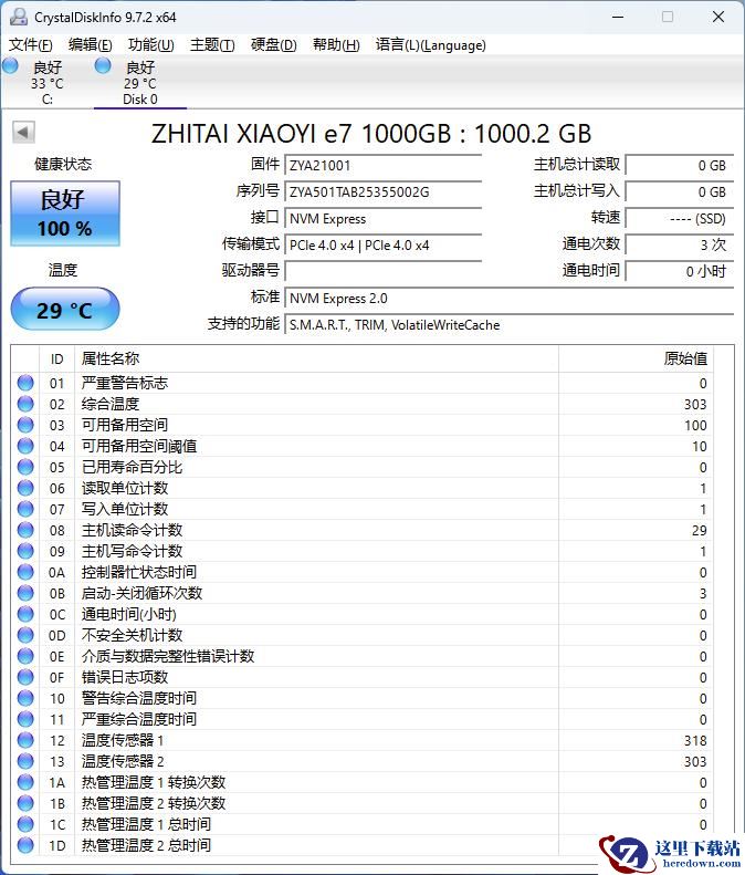 致态小翼e7 1TB使用PCIe 4.0 x4接口,支持NVMe 2.0协议。过去致态SSD的固件版本以及序列号都是以ZT(致态的拼音首字母)开头,而致态小翼e7则是以ZY开头,Y代表了(小)翼。