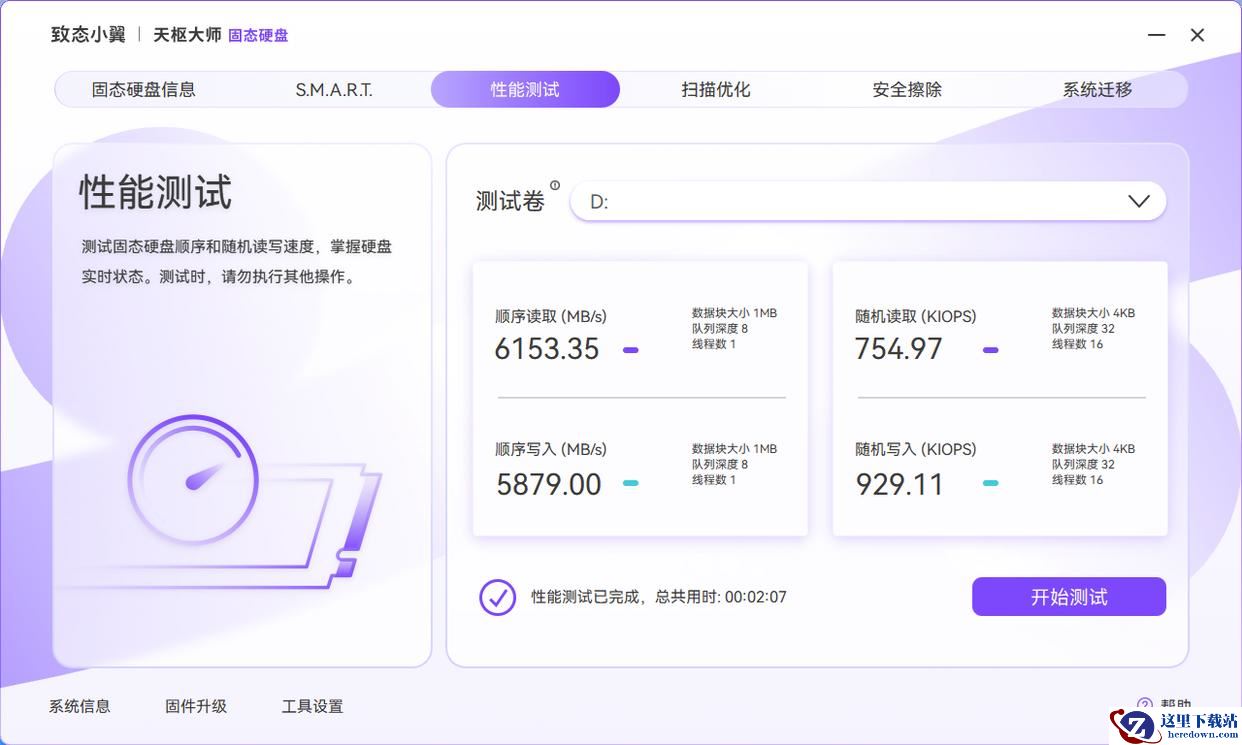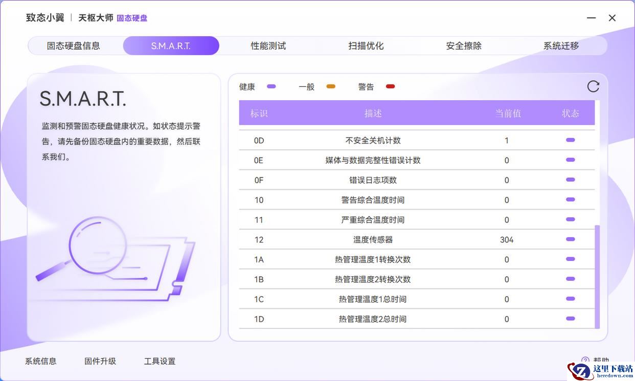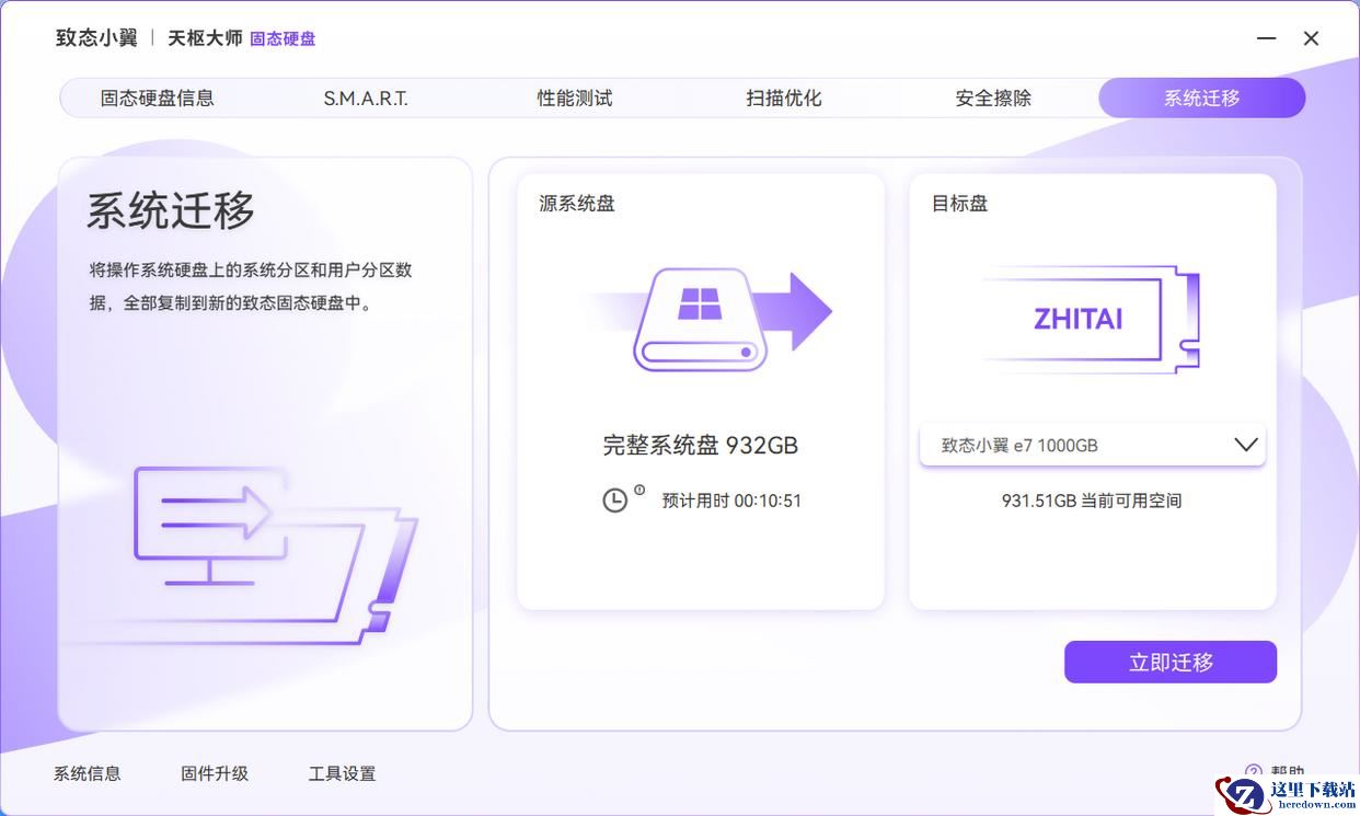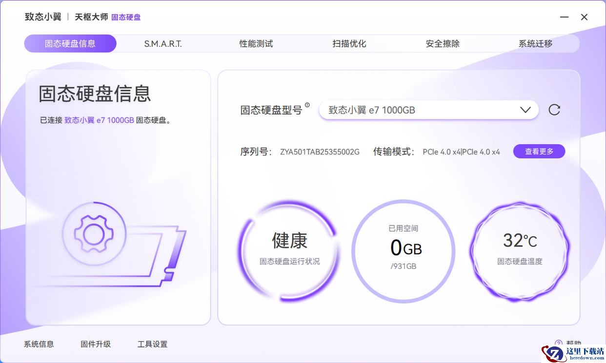 除了原有的SMART健康信息和安全擦除等功能之外,新版天枢大师增加了清新配色的致态小翼皮肤,并新增性能测试、扫描优化和系统迁移功能。