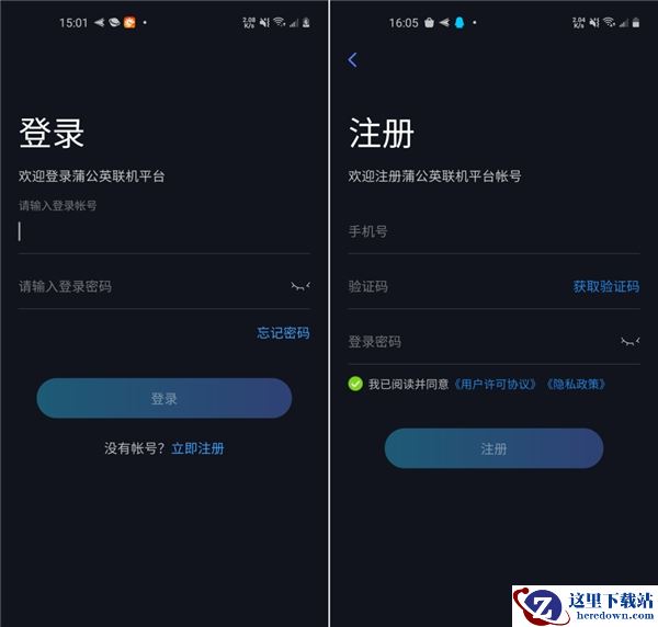 下载并安装后,我们打开APP进行登录/注册操作,成功后即可进入蒲公英联机平台APP。