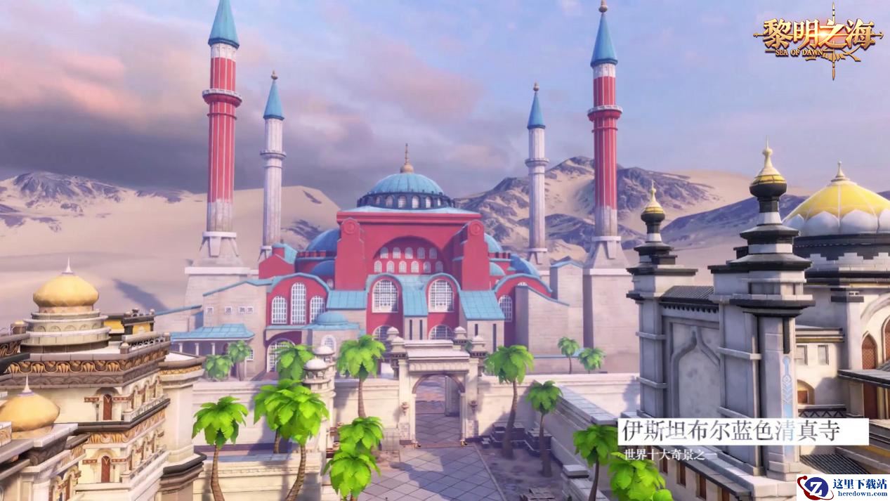 《黎明之海》游戏中的蓝色清真寺场景在荒芜的山前巍然耸立,简化了部分修饰性建筑却更突出了清真寺肃穆的威严。冒险家们也将在这里体会到不同于欧洲风土人情的中亚地中海风情。