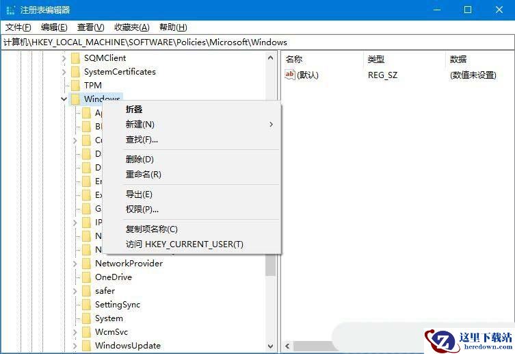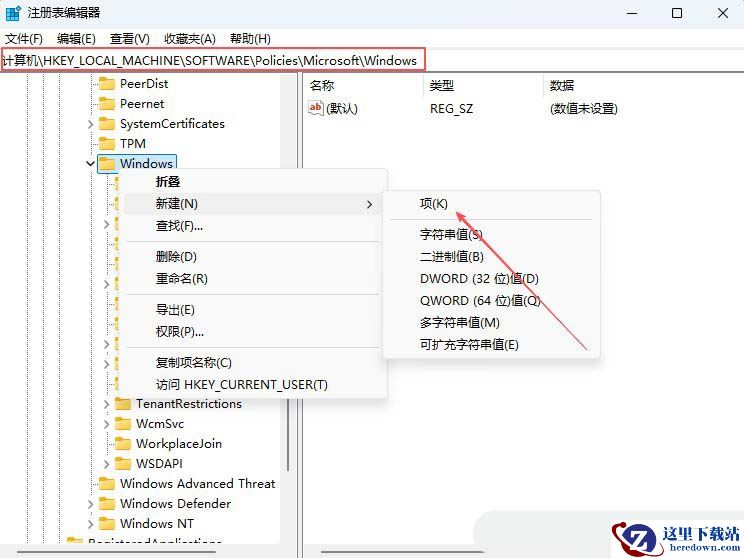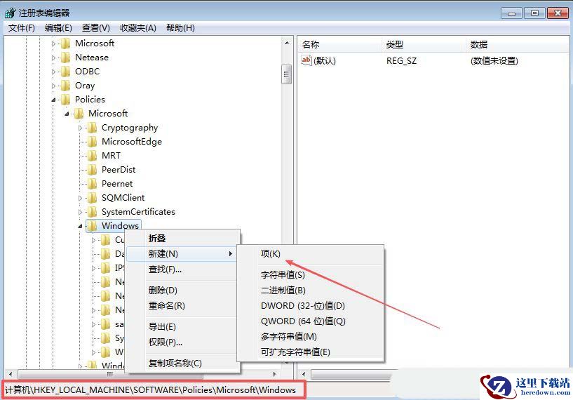 2、接着,在打开的界面中,依次点击打开“HKEY_LOCAL_MACHINE/SOFTWARE/Policies/Microsoft/Windows”,右击选择新建一个“EdgeUI”项。