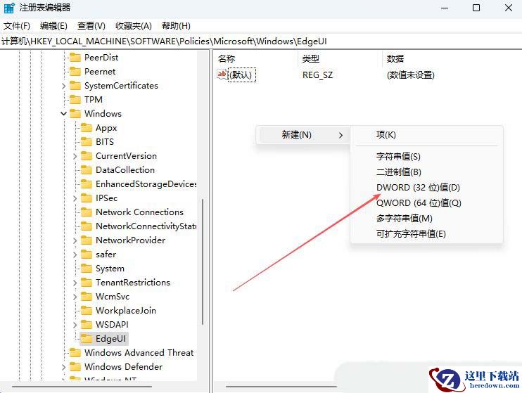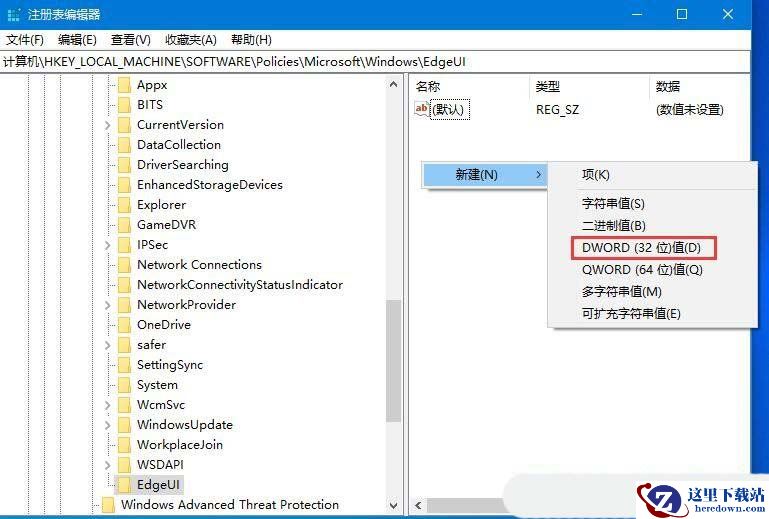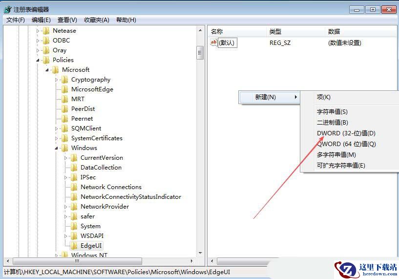 2、接着,在打开的界面中,依次点击打开“HKEY_LOCAL_MACHINE/SOFTWARE/Policies/Microsoft/Windows/EdgeUI”,若没有“EdgeUI”项,可右击选择新建一个。