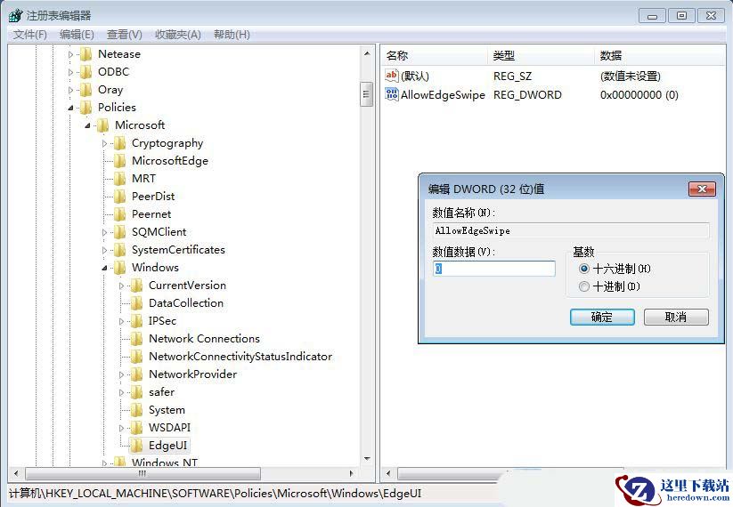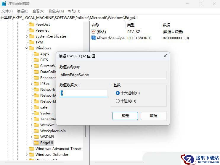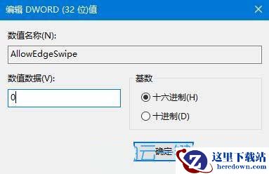 4、随后,双击打开“AllowEdgeSwipe”值,设置其“数值数据”值,点击确定即可。(注:0表示关闭,1表示开启)