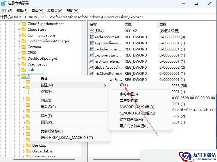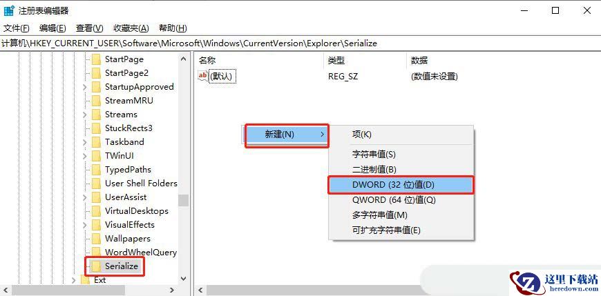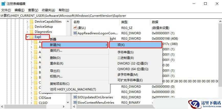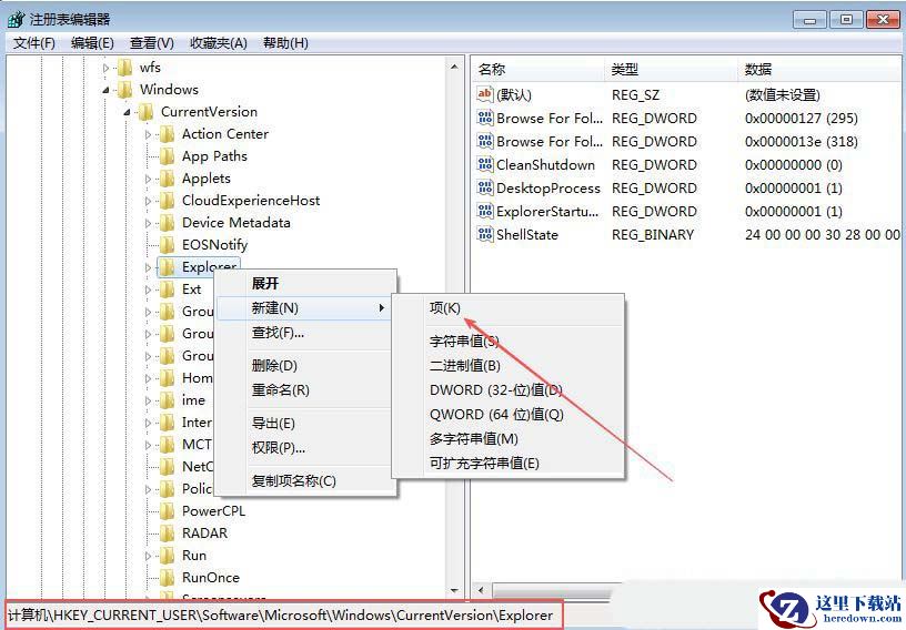 2、接着,在打开的界面中,依次点击打开“HKEY_CURRENT_USERSoftwareMicrosoftWindowsCurrentVersionExplorer”,并右键点击“Explorer”,选择新建一个名为“Serialize”的项。
