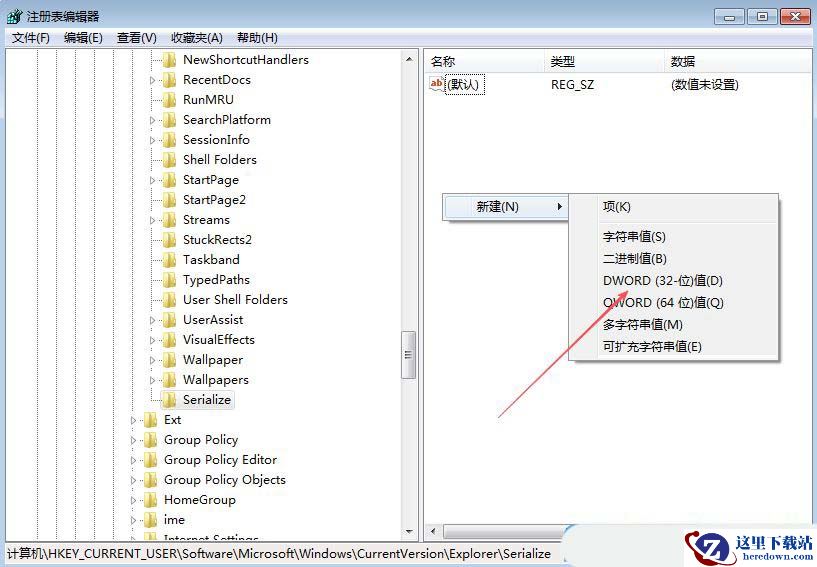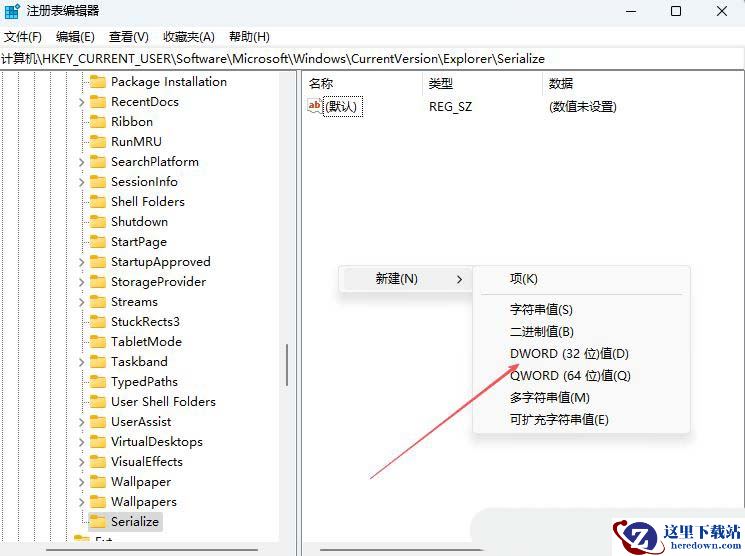 2、接着,在打开的界面中,依次点击打开“HKEY_CURRENT_USERSoftwareMicrosoftWindowsCurrentVersionExplorer”,再右键点击“Explorer”,选择新建一个名为“Serialize”项。