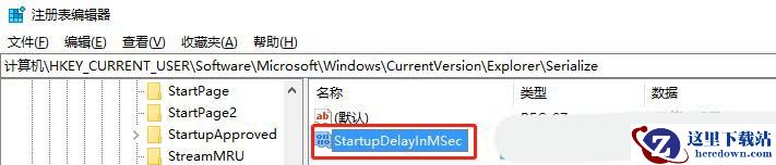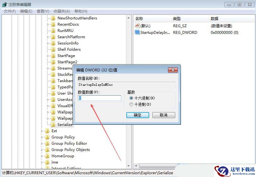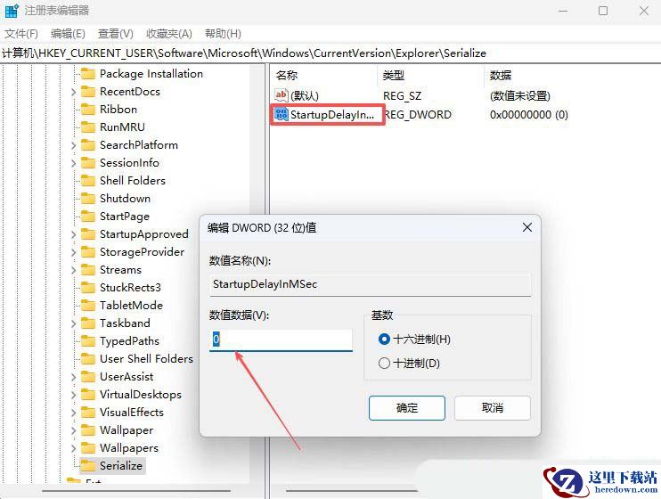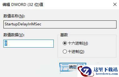 6、最后,双击打开StartupDelayInMSec,在编辑 DWORD (32 位)值窗口中,将数值数据设置为 0 ,并确定即可;