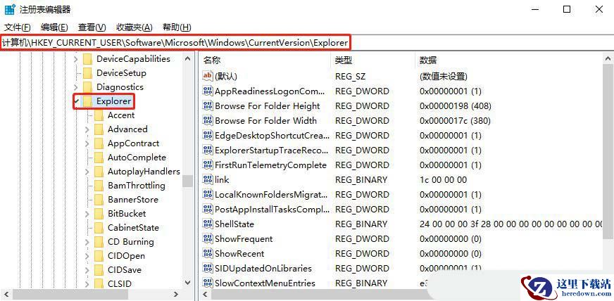 2、注册表编辑器窗口中,依次展开到以下路径:HKEY_CURRENT_USERSoftwareMicrosoftWindowsCurrentVersionExplorer