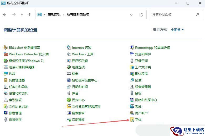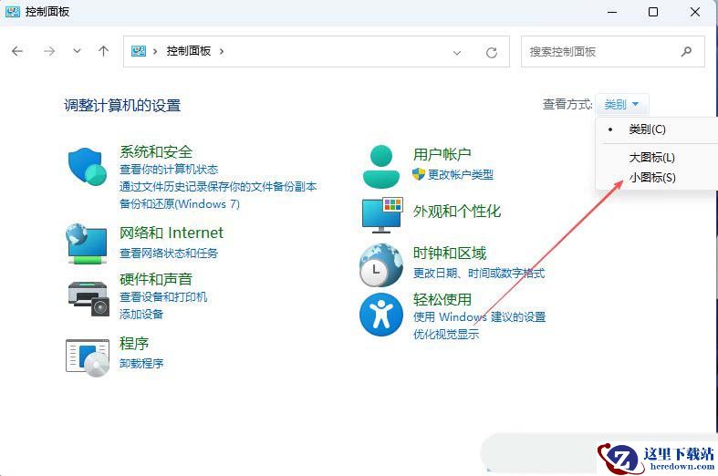 1、首先,打开Win11系统的控制面板界面,并设置“查看方式”为“小图标”。