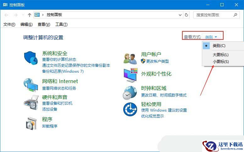 1、首先,打开Win10系统的控制面板界面,并设置“查看方式”为“小图标”。