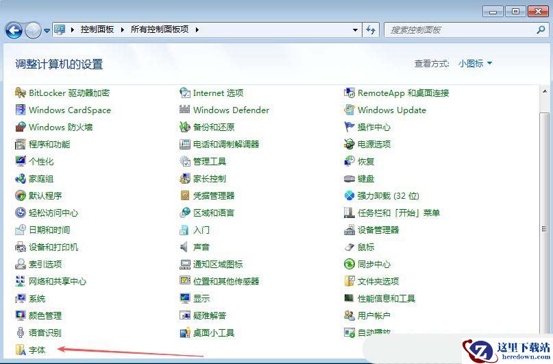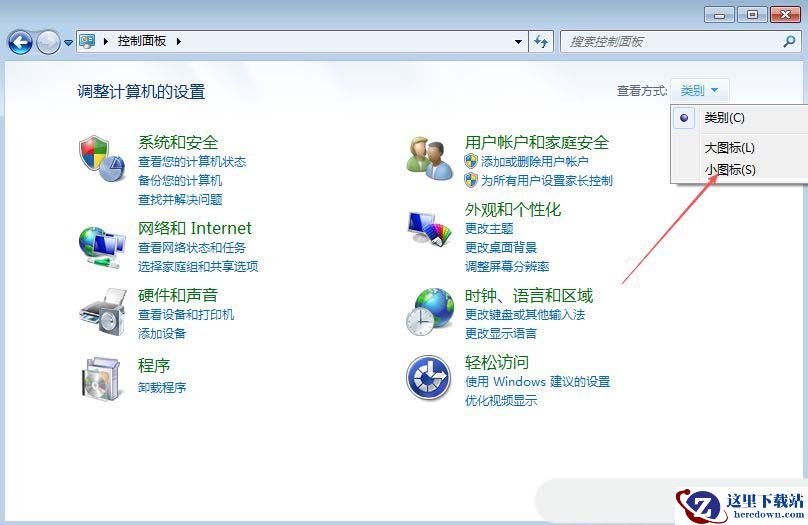 1、首先,打开Win7系统的控制面板界面,设置“查看方式”为“小图标”。