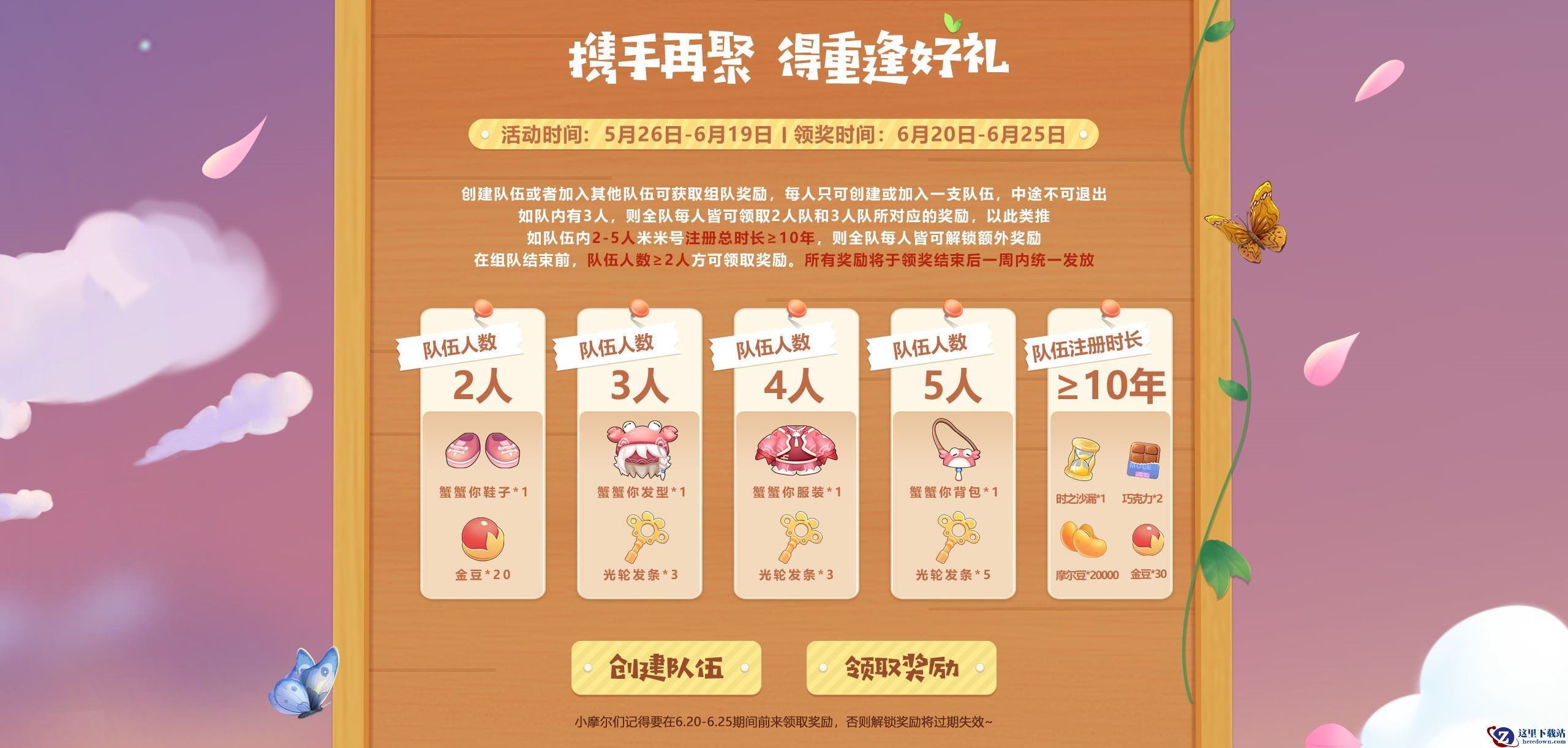 小摩尔们还记得与好友们在庄园里一同玩耍时的快乐心情吗?这样的美好回忆不会消失!本次回归活动期间,创建或加入队伍即可领取相对应的奖励,集齐五人小队且满足10年以上的队伍注册时长要求,即可领取游戏内活动专属“蟹蟹你”系列装扮,快拉上昔日好友一同前来参加吧!