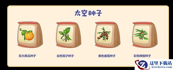 原来这次土地节,土伯伯给小摩尔带来了来自太空的变异种子,分别是太空茄子种子、太空番茄种子、太空南瓜种子和太空彩椒种子。
