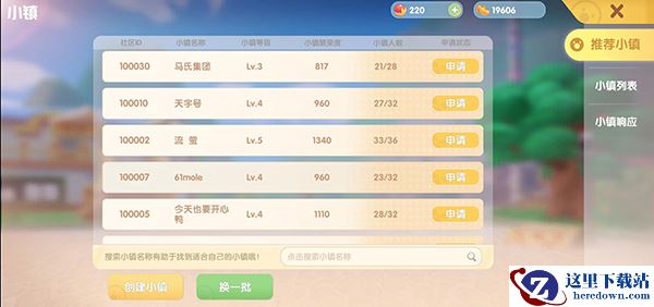 解锁"小镇"功能后我们在主界面的"好友"图标上方会出现一个"小镇"图标,我们可以通过这个功能申请加入其它小摩尔的小镇,或是自己创建小镇。