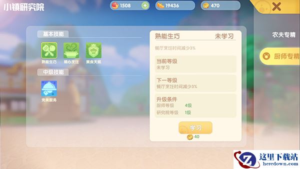 厨师方面,可以学习缩短烹饪时长,加快菜谱研究速度等技能。