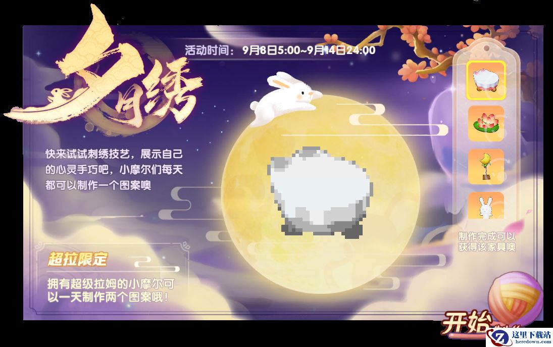 本次中秋活动庄园特意给大家安排了一组充满中秋特色的夕月绣,每个小摩尔每天有一次制作图案的机会,只要按照指示完成图案的绣制,就可以领走对应的家具啦~拥有超级拉姆的小摩尔可以一天制作两个图案哦!