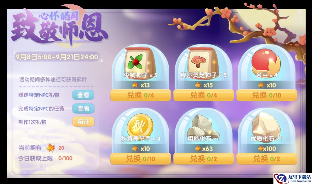 通过完成教师节相关活动任务即可获得一定数量的枫叶,拿到足够数量的枫叶就可以兑换自己心仪的物品啦~