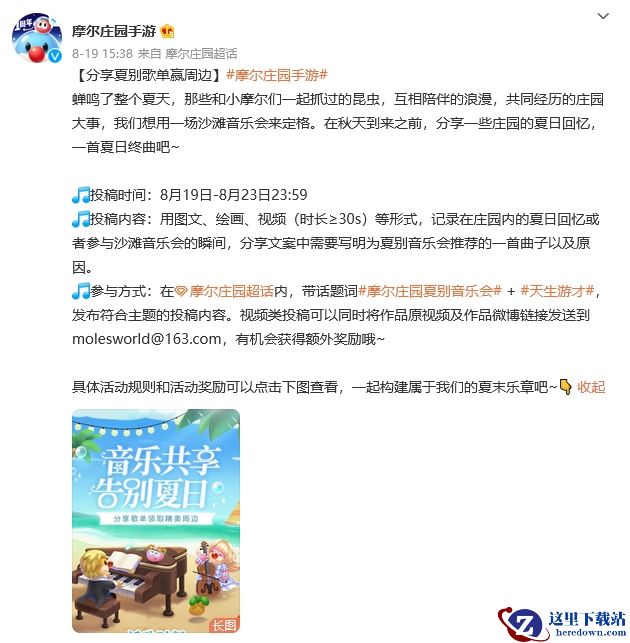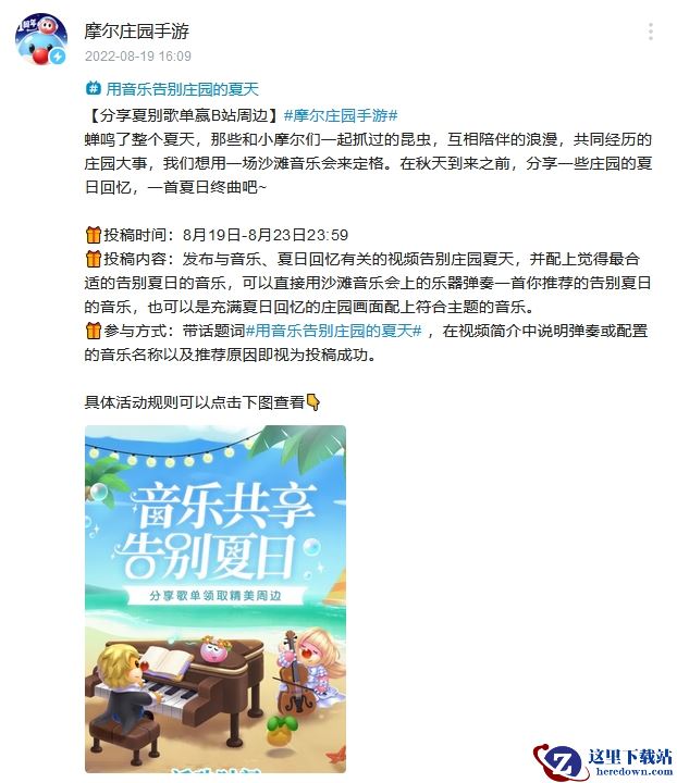 庄园最近有很多可以参与的活动哦,只需要分享夏别歌单就可以赢取精美周边。具体的内容已经为大家整理好了,家摩们快来官方微博和官方B站看看吧!