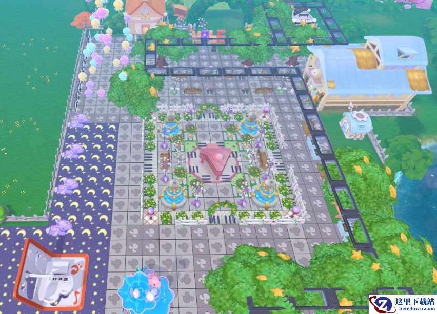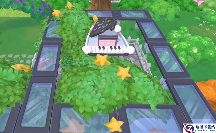 在小摩尔@你的小肥仔吖 家园的中心,是被栅栏包围的小型露天演奏区。区域的四角搭配了相应数量的喷泉和花丛,中间的经典款草莓三角钢琴妥妥占据着C位。