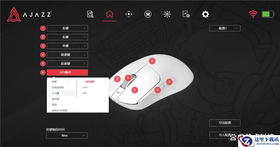 第二页是鼠标按键功能自定义界面,当然,你也可以设置按键响应时间,导出或者导入配置。