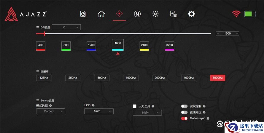 第三页是鼠标的DPI、回报率以及传感器模式等设置,这里我们最高可以将DPI设置到32000,最低为50,回报率最高8000Hz,最低则是125Hz。此外还有波纹控制、直线修正等功能开关。