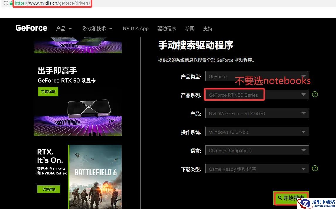 首先,我们要安装显卡驱动。记住这个地址,一个字母都不能错。然后找到右边的驱动程序,点进去,找到手动驱动搜索。这里要注意,第一个框框不要选(Notebooks),那是笔记本的;第三个框框选择你的显卡型号,比如我是5070;系统选择你的系统,我用的是Win10。点击蓝色方框确认一下驱动版本572.83,然后点击查看。