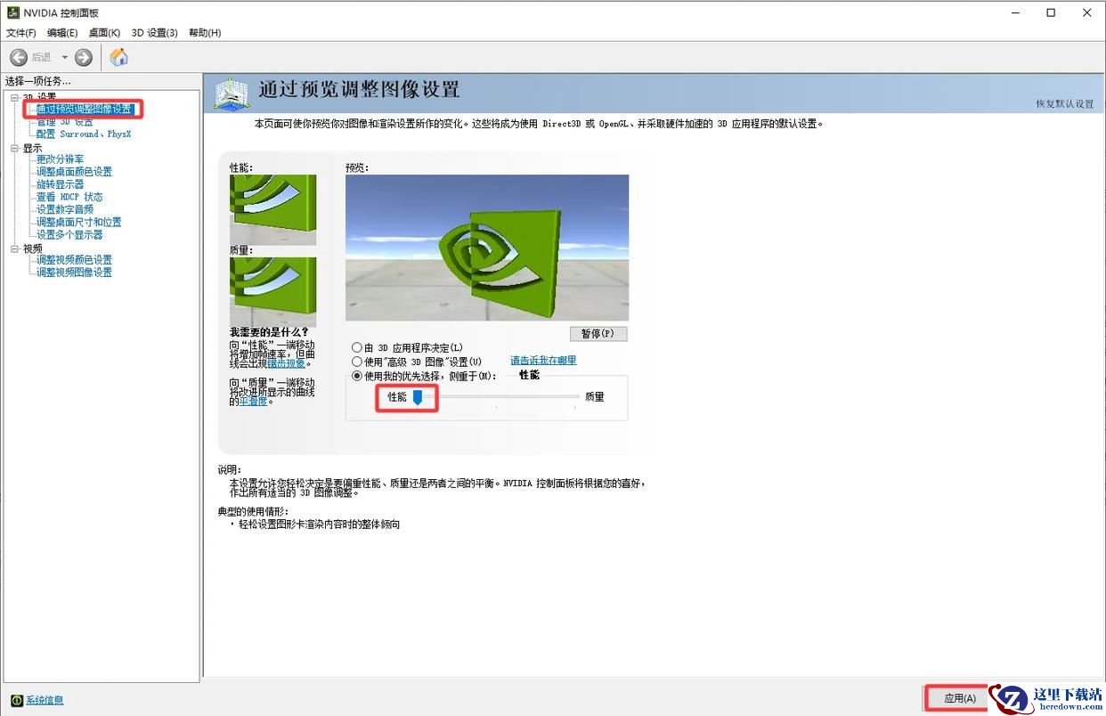 驱动安装好后,接下来就是必要的设置优化了。我们在桌面右击进入控制面板。第一个设置,通过预览选择,选择第三个圈圈,也就是性能优先,侧重性能,然后记得点应用。第二个选项意义不大,不用设置。