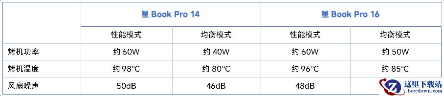 烤机分析:性能模式下,星Book Pro 14的CPU考机功率约60W(最近温度降低了,如果室温偏高持续功率约为55W),温度在98℃上下,星Book Pro 16的CPU考机功率也是60W,温度大概是96℃。满载下两款机型的用户位噪声都不算吵,但星Book Pro 16表现更好一些:星Book Pro 14是50分贝,星Book Pro 16是48分贝。同时两款机型的C面温度也都不高,最高不过40℃上下,满载时C面很凉快。