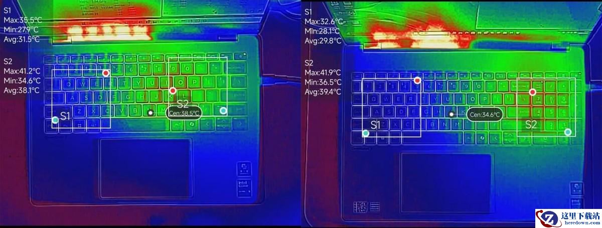 性能模式下的满载C面温度图,左侧是星Book Pro 14,右侧是星Book Pro 16
