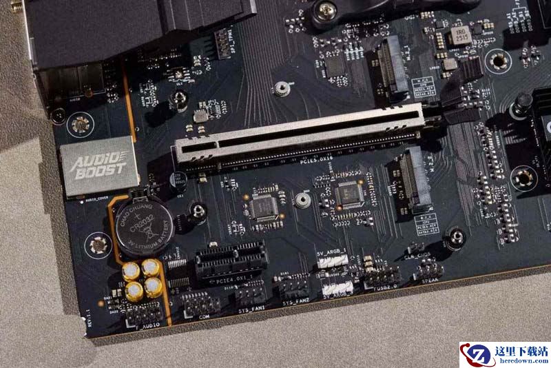 CPU 下方提供 1 条带有铝合金加固的 PCIe 5.0x16 显卡插槽,上下各有 1 条 PCIe5.0 M.2 插槽,再下方还有 1 条 PCIe 4.0x1 插槽,支持连接声卡等扩展件。右侧最下方还有第 3 条 PCIe 4.0 规格的 M.2 插槽,同时还保留了 4 个 SATA 接口,存储扩展性到位。