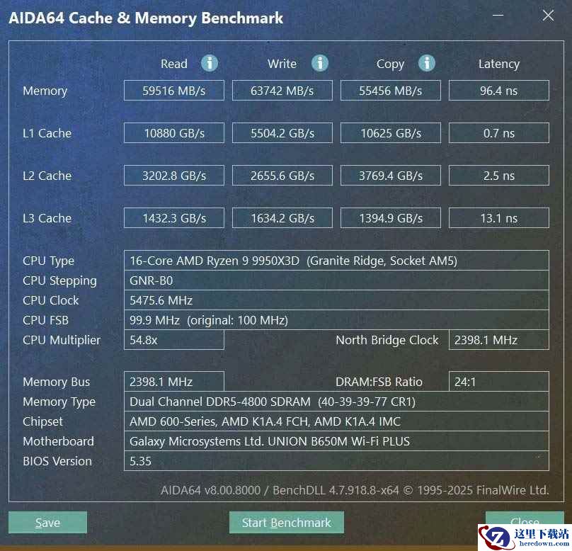 内存方面,由于影驰联盟 B650M Wi-Fi 黑武士 PLUS 主板的 BIOS 中提供了 XMP/EXPO 超频功能和高带宽 + 低延迟选项开关,我们直接通过 AIDA64 看下内存性能的表现。首先是默频模式,AIDA64 显示的内存时序为 40-39-39-77 CR1,此时: