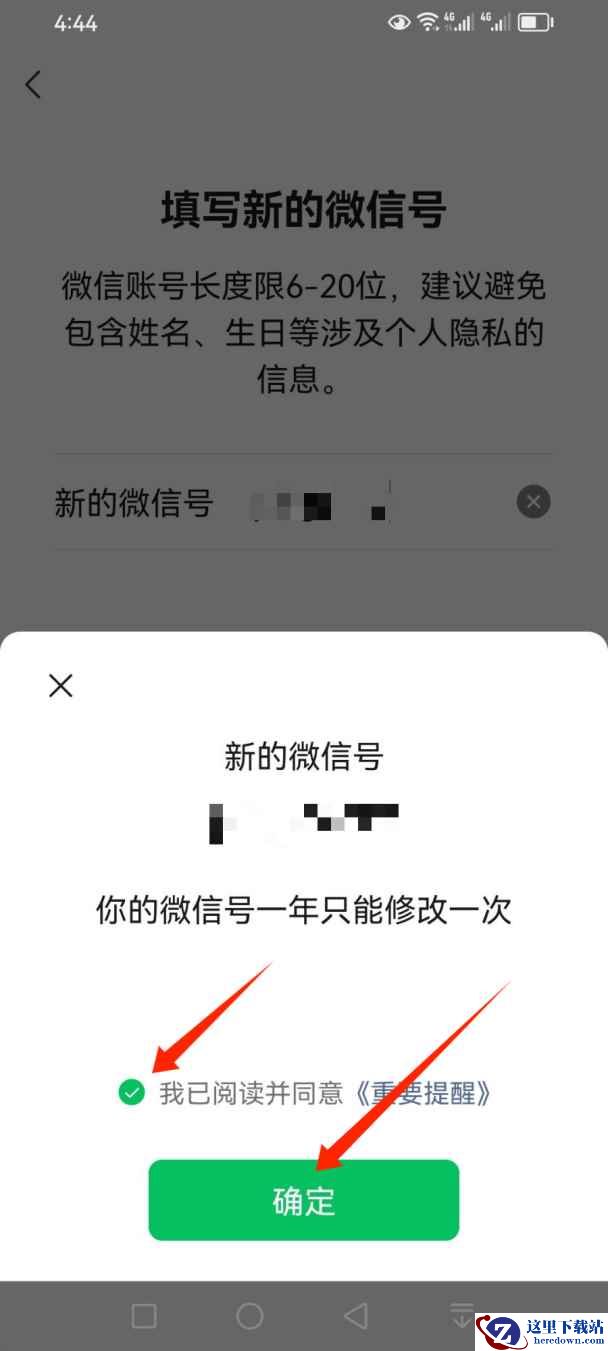 接下来会看到弹窗提示:你的微信号一年只能修改一次,如果确定要使用刚刚输入的微信号,可勾选【我已阅读并同意《重要提醒》】,点击【确定】按钮完成修改即可。
