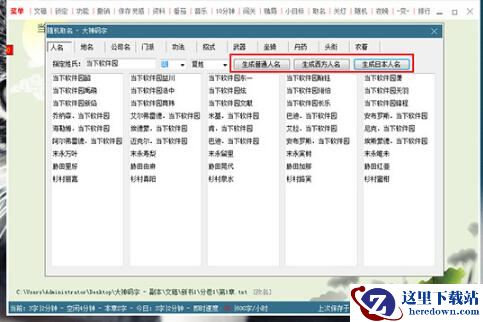 2、在上一步点击之后,将会弹出随机取名的窗口,默认是“人名”栏目,首先来说说怎么为人物取名,用户只需要在指定姓氏中输入想要取的姓氏,接着选择性别与单、复姓,最后点击“生成普通人名”、“生成西方人名”或“生成日·本·人名”三种不同类型的名字,在下面的图片中,前三行是普通名字,也就是所谓的中国人名,中间三行是西方人名,其中的“当下软件园”就是姓氏,至于最后三行的日·本·人名则不受指定姓氏的影响,还是会进行随机取名,如下图所示: